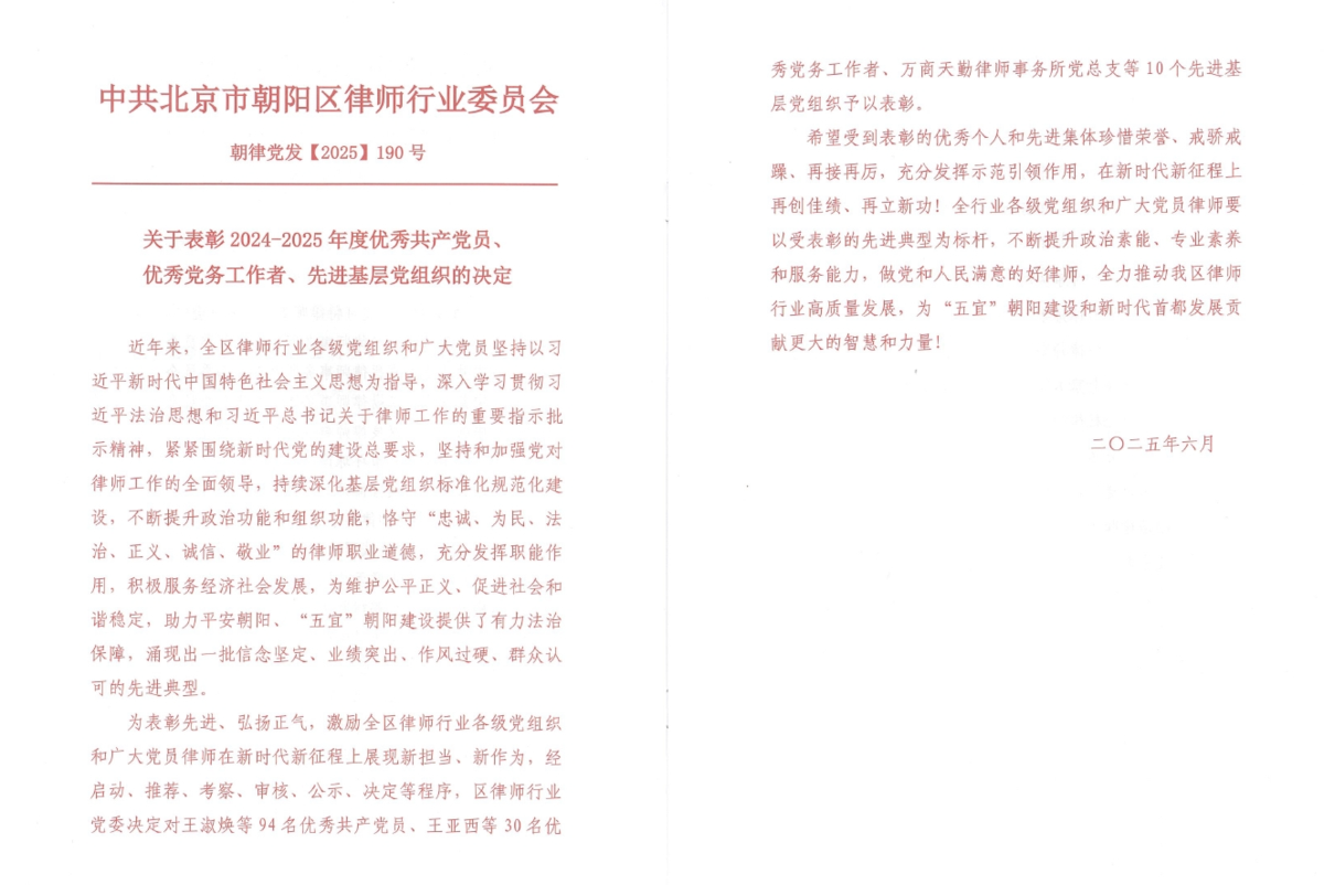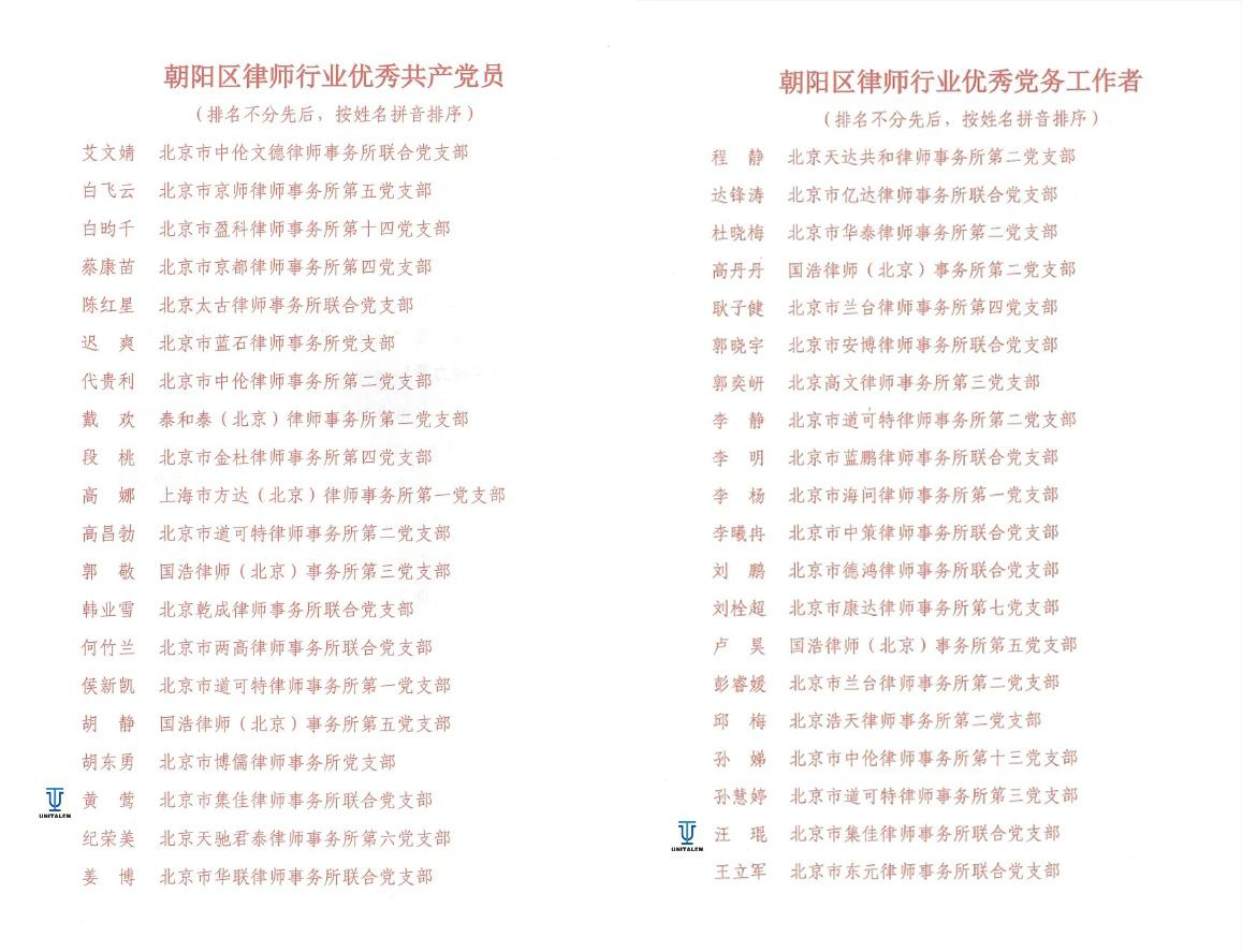 6月27日,朝阳区律师行业党委召开了朝阳区律师行业庆祝中国共产党成立104周年暨总结表彰大会,米兰体育官网联合党支部党员黄莺荣获“朝阳区律师行业优秀共产党员”称号,支部党员汪琨荣获“朝阳区律师行业优秀党务工作者”称号。